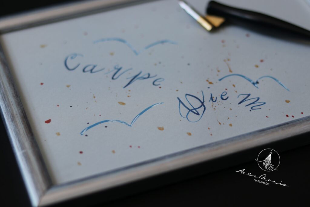Dotknęłam także kaligrafii, gdzie lekko trzęsącą ręką próbowałam wydobyć tuszem hasło Carpe Diem, z którym utożsamiam się od lat. Te wszystkie spotkania skłoniły mnie do podjęcia decyzji o dalszej nauce różnych technik, a także zainspirowały mnie do ich łączenia, co daje ciekawe, niepowtarzalne rozwiązania rękodzielnicze.